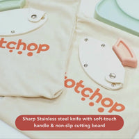 Meet Totchop's Parent Set. With a sharp rocker knife, it's the fastest and easiest tool for prepping bite-sized foods for your kids. Say goodbye to shears and pizza cutters and hello to one-handed, super-fast meal prep.